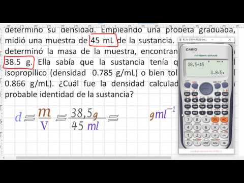 Para identificar una sustancia líquida, una estudiante determinó su densidad. Empleando una probeta graduada, midió una muestra de 45 mL de la sustancia. A continuación, determinó la masa de la muestra, encontrando que pesaba 38.5 g. Ella sabía que la sustancia tenía que ser alcohol isopropílico (densidad 0.785 g/mL) o bien tolueno (densidad 0.866 g/mL). ¿Cuál fue la densidad calculada y cuál es la probable identidad de la sustancia